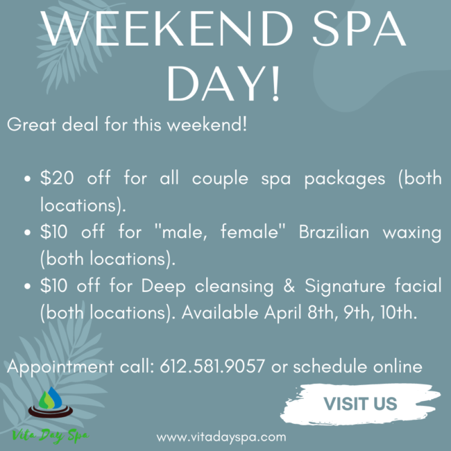 ![Great deal for this weekend! [First Name ], $20 off for all couple spa packages (both locations). $10 off for male, female Brazilian waxing (both locations). $10 off for Deep cleansing & Signature facial (b](https://www.vitadayspa.com/wp-content/uploads/2022/04/Great-deal-for-this-weekend-First-Name-20-off-for-all-couple-spa-packages-both-locations.-10-off-for-male-female-Brazilian-waxing-both-locations.-10-off-for-Deep-cleansing-Signature-facial-b-650x650.png)