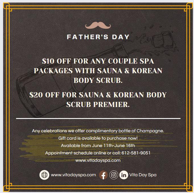 Celebrate Father’s Day with special offers at Vita Day Spa! π From June 11th to June 16th, enjoy $10 off any couple spa packages with sauna & Korean body scrub, and $20 off sauna & Korean body scrub premier.